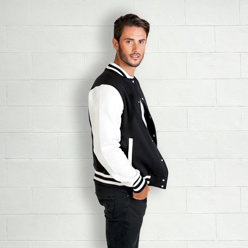 Make your brand stand out with this classic two-tone varsity jacket, designed with a smart button-up closure and a timeless sporty look. Crafted from soft, durable fabric, it offers warmth, comfort, and everyday wearability. The ribbed collar, cuffs, and waistband ensure a neat fit while enhancing its athletic appeal.